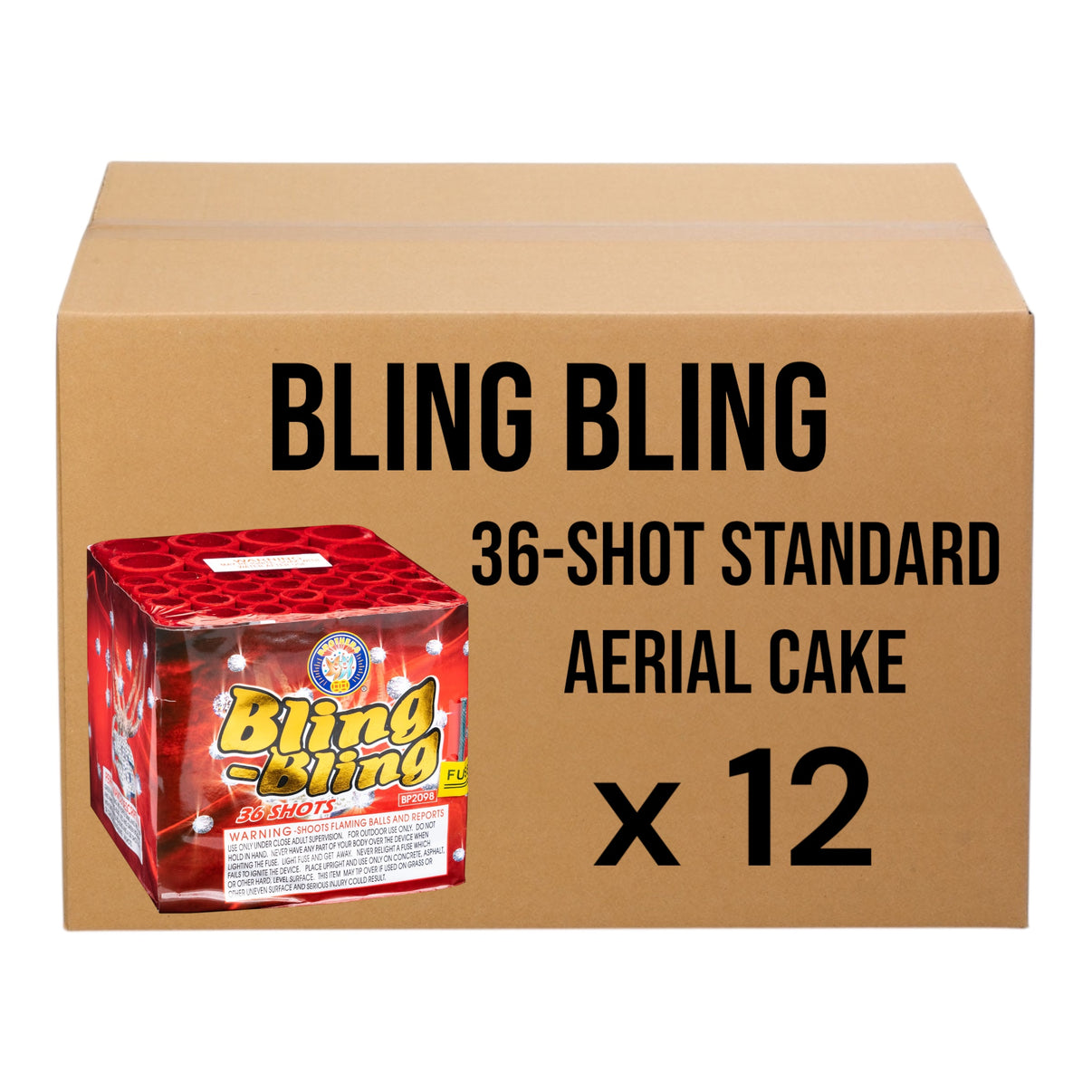 Bling Bling is a staff favorite and one of the best multi-shot cakes in America. This dazzling 38-second display lights up the sky with shimmering green bling and purple stars, followed by vibrant red, blue, and white bling bursts. It finishes strong with red and green bouquets accented by time-delay bling and crackling effects.