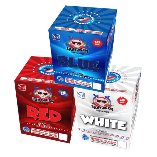 Red/White/Blue is a case containing four sets of three patriotic cakes—RED, WHITE, and BLUE—in each set. Packaged in a durable plastic bag with handles, this 12-cake assortment is ideal for retailers aiming to offer customers a complete, themed fireworks experience.