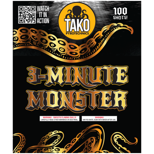 3-Minute Monster is a high-performance fireworks cake that delivers a full 180 seconds of continuous action. Packed with an impressive variety of effects—color palms, glitter, crackling tails, flying fish, brocade crowns, and more—this long-duration item is ideal for retailers looking to offer premium show-stopping products that add value and spectacle to any fireworks display.