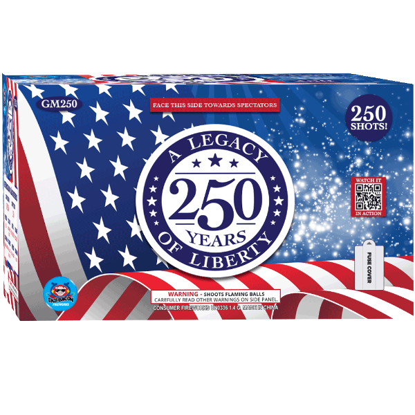 250: A Legacy of Liberty is a patriotic powerhouse featuring 250 shots of color comet effects that fan wide across the sky. This high-performance cake builds in intensity, delivering a sweeping, fast-paced visual before erupting in a bold and loud finale. Designed for backyard celebrations or show-stopping finales, this item offers excellent pacing, coverage, and shelf appeal.
