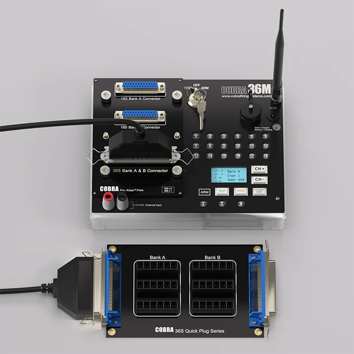 Each firing module has two independent banks (A & B) that can be set to one of 100 unique channels (200 on firmware 6.0.0 or higher) by simply pressing the + and - buttons on the module. For example, bank A can be set to channel 1 and bank B can be set to channel 2. Each bank connects to the included series or parallel 36S Quickplug Slat using the onboard Centronics 50 connector. Using the 18R or 18R2 Controller channel controls, you can fire any banks on the same channel. You can fire unlimited modules at the exact same time by setting them to the same channel.