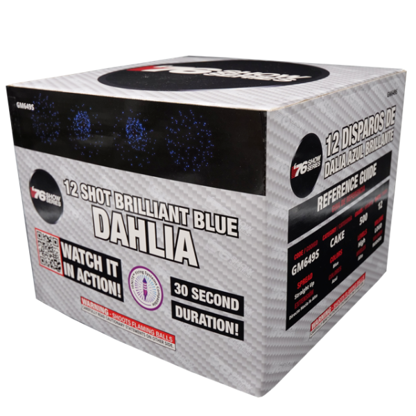 GM643S – 12s Red/White/Blue Dahlia Assortment features one each of red, white, and blue dahlia effects in a crisp, 30-second multi-shot format. This patriotic trio is perfect for color-themed shows, finale sequences, or as a standalone backyard display.