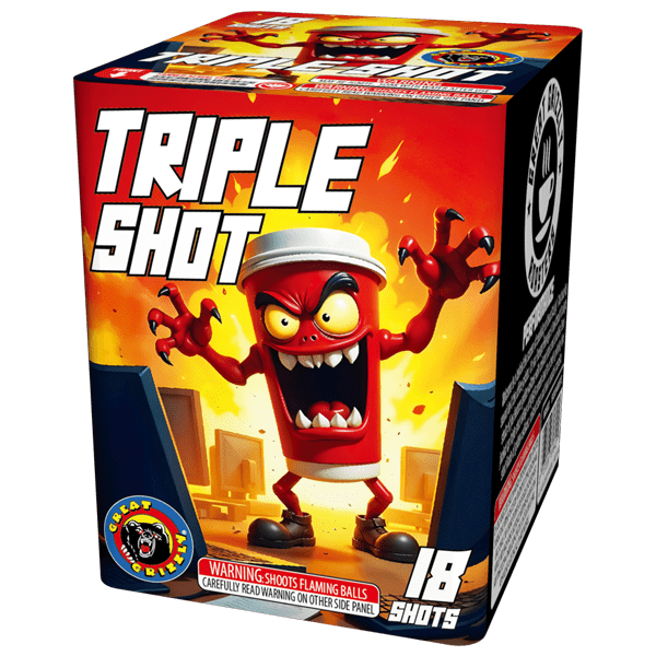 WHEWWW!!!!! Welcome to a behind-the-scenes look at creativity at Great Grizzly! That buzzing sound isn't the office printer; it's our Transpo Manager's heartbeat! 8 single shots of joe feature golden willows with colored stars and crackles Then jacked-up triple-shot volleys of R/W/B comets lead to a teeth-grinding four-shot finale of golden willows, colored stars, and bean roastin' crackles.