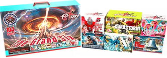 The Grand Six — 104-Shot RDX Cake Assortment: Step into the spotlight with The Grand Six, a powerhouse assortment of Sunburnt Paradise, Warshield, Scarlet Blitz, Liberty Strike, Seattle Sizzle, and Corn Storm.