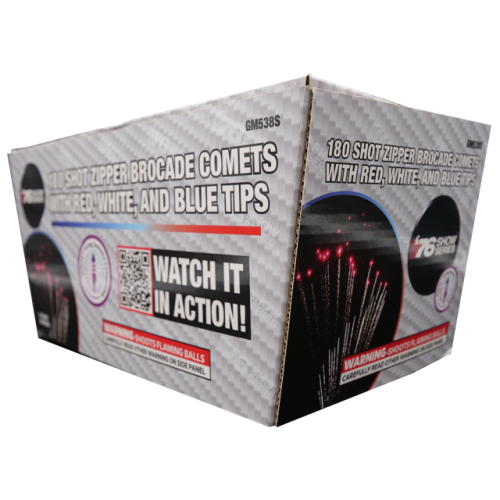 A fast cake that fills low-to-mid sky. Get 60 red comets, 60 white comets, then 60 blue comets, each with a sparkling golden tail. This cake has had the tube spacing minimalized, making the cake size smaller, but allowing the same tube size, break height, and effect, as the original, larger sized cakes.