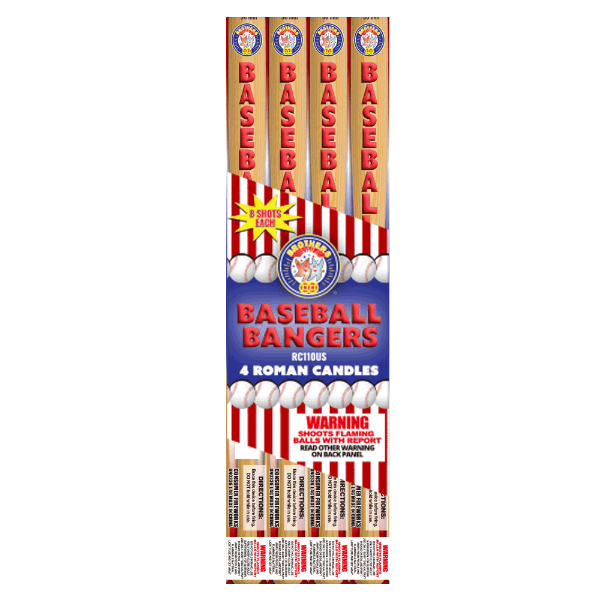 Baseball Bangers knock it out of the park with 8 hard-hitting shots of red and blue stars—each capped off with a loud report. These roman candles are among the loudest in our lineup, making them a favorite for backyard shows that want to be heard as well as seen.b