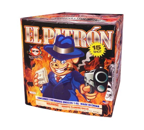 El Patron delivers an explosive cartel of effects, featuring crackling tails that burst into red, white, and blue followed by a dynamic whistling tail that shifts to orange and blue with shimmering gold glitter. The action builds with a whirling tail that culminates in a beautiful chrysanthemum effect. With its diverse range of effects, this cake adds depth and excitement to any fireworks display.