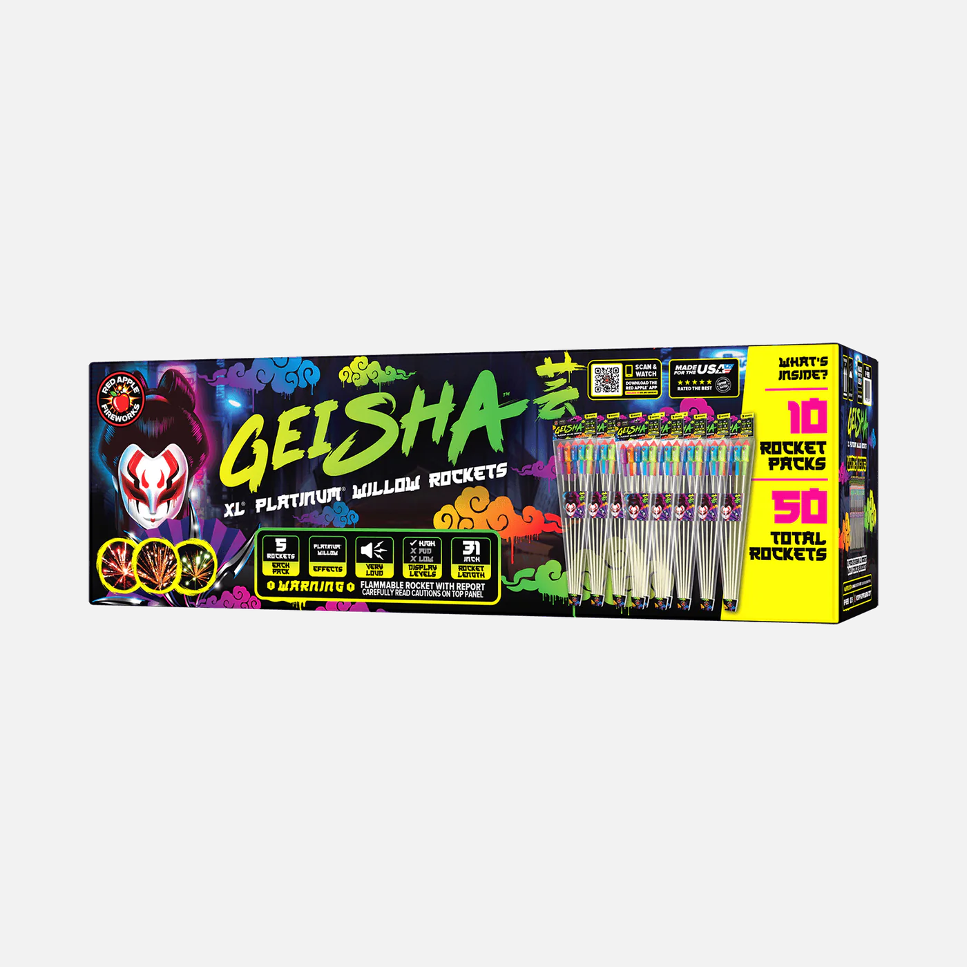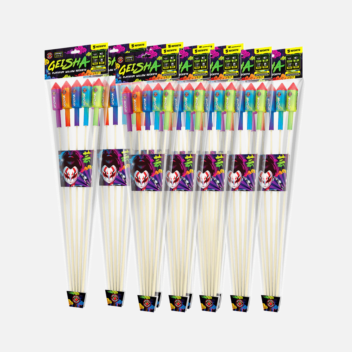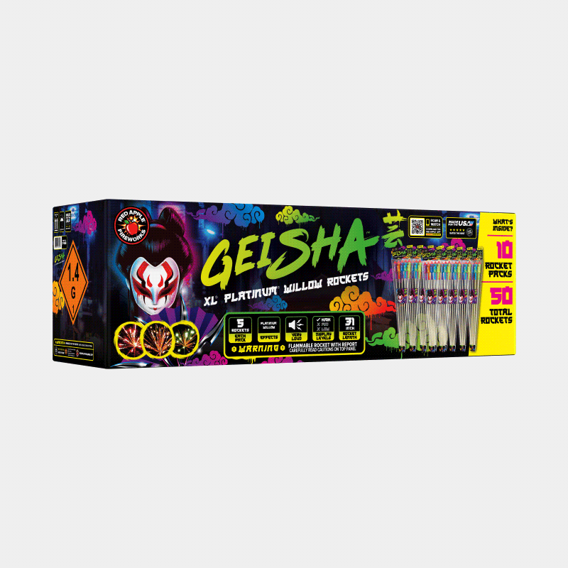 Becoming the hostess with the mostess is easy when you have Geisha® XL® Platinum® Willow Rockets. These firey rockets go off with a literal bang with effect options like platinum willows and strobe/glitter. With neon reds, blues and greens to explore, this collection is sure to shoot a rocket up anyone's kimono. 🏯