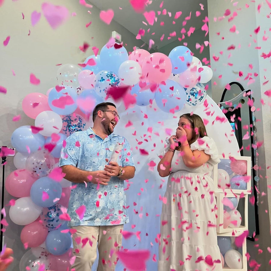 Keep everyone guessing until the gender reveal color cannons are launched and the pink confetti popper pops revealing the baby's gender.