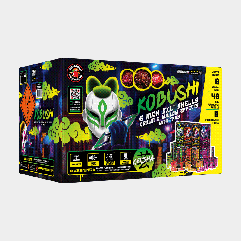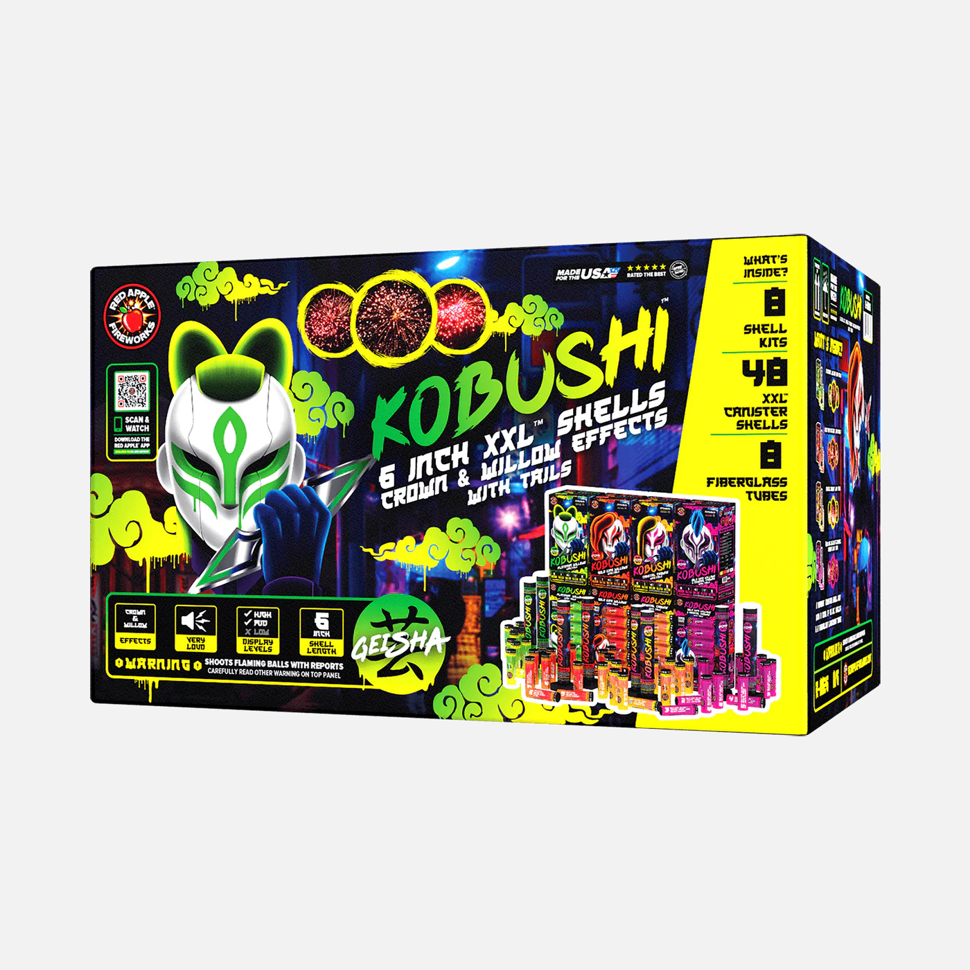 The crown and willow effects of these XXL™ Kobushi™ shells offer the classic feel of your favorite fireworks. Every launch flies high with a barrier-breaking BOOM that will light up the sky. 🌌