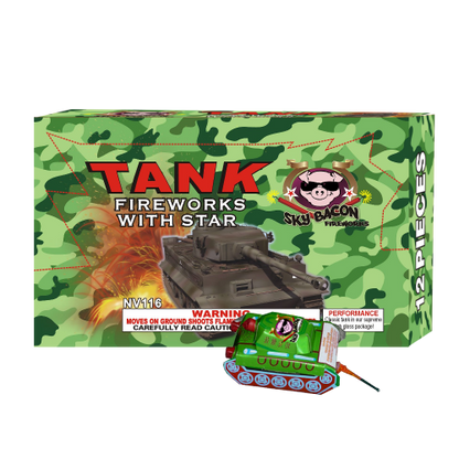 Tank with Star is a timeless novelty firework perfect for all ages. These classic tanks roll forward and light up with a fun star effect, making them ideal for safe and sane celebrations. Great for family-friendly events and backyard fun.